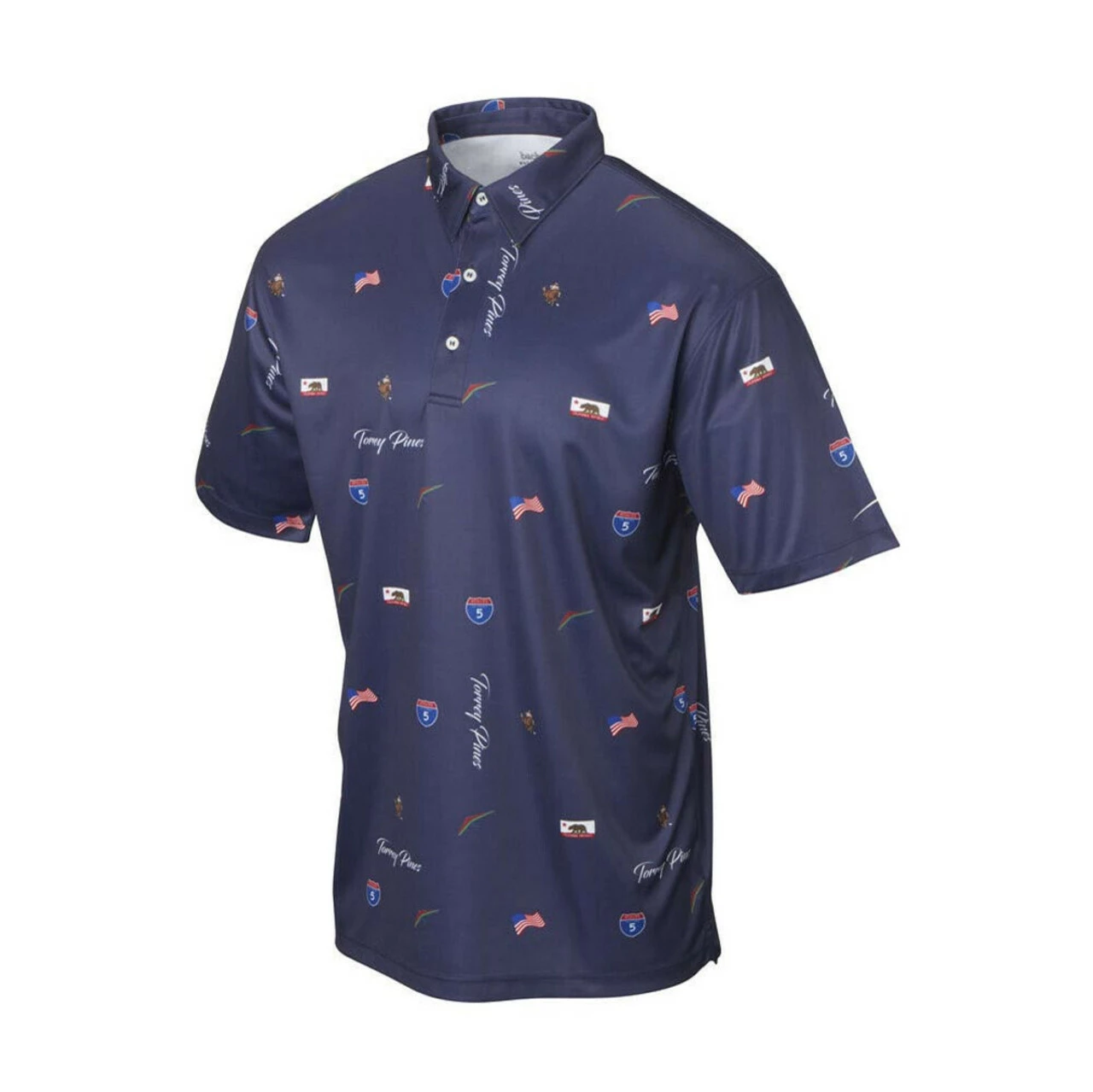 Backspin Torrey Pines Polo pays homage to the world famous golf course with bold and fun designs throughout. The stretch fabric polo features a triple button placket and self collar for a classic look and timeless style.